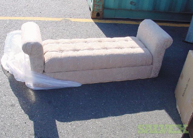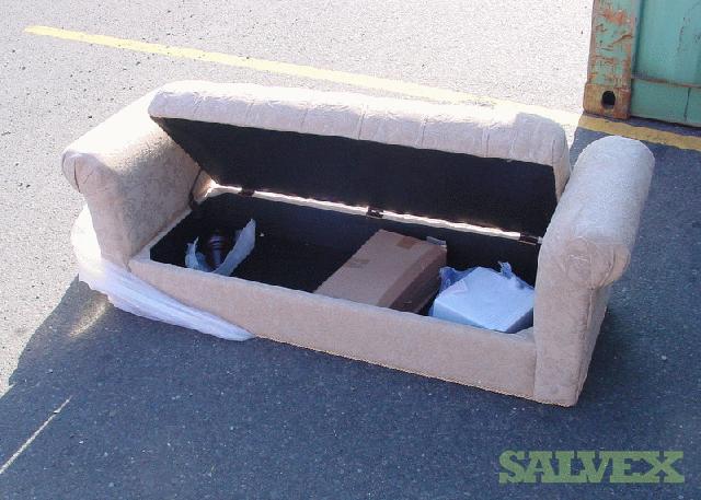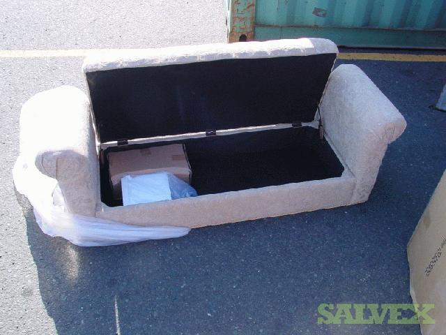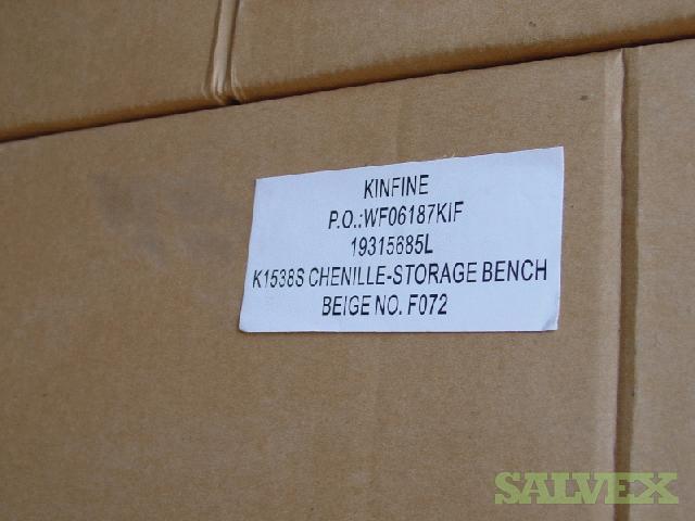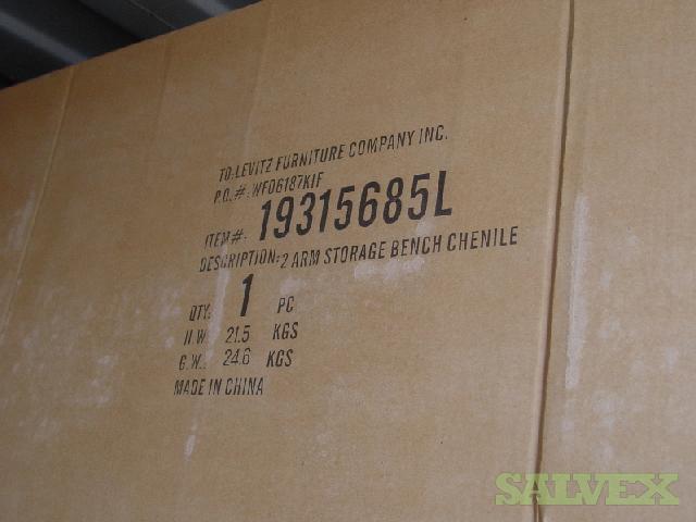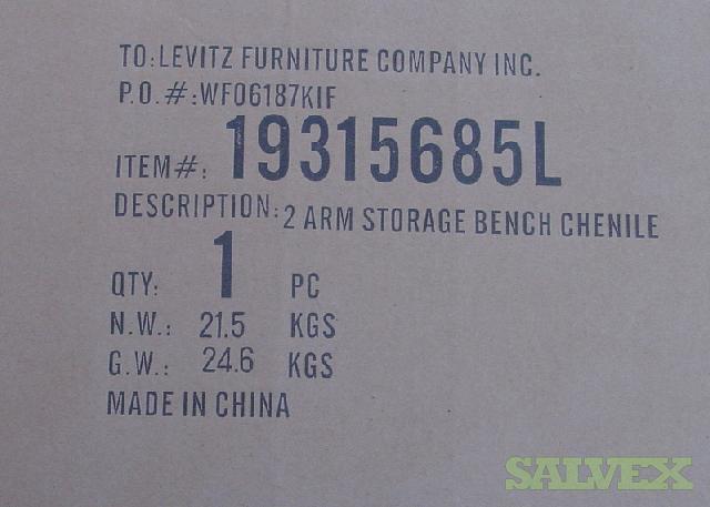 This shipment of Levitz Flip Top 2 Rolled Arm Chenile Tufted Storage Benches is available due to abandonment and must be sold to recover funds for the shipping company. The product is labeled for Levitz Furniture