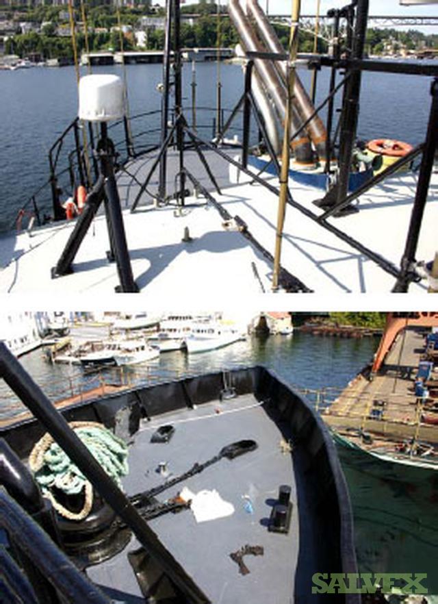 This Vessel is a Pearl Harbor Survivor and was hit during original attack shortly after being built. According to Seller, vessel is in top shape and can be mobilized quickly. The 2 aluminum storage tanks on the center deck can be easily removed to clear up space.