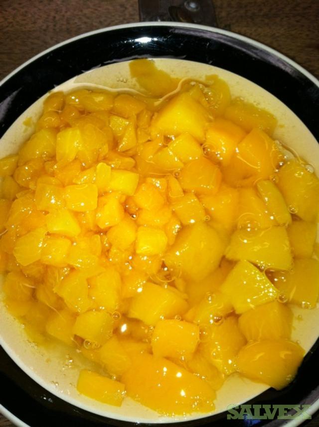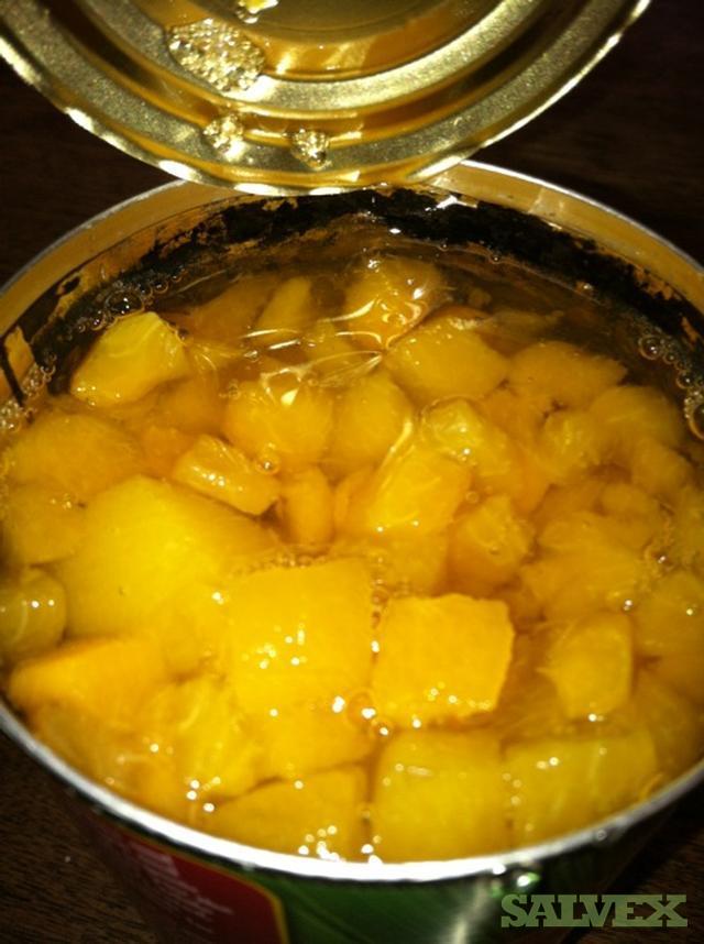 This lot of Organic Canned Peach & Apricot Medley diced in Organic Apple Juice is available because customer rejected the product due to a slight tin smell and is being sold to recover funds and storage space. Per Seller, there is no tin taste.