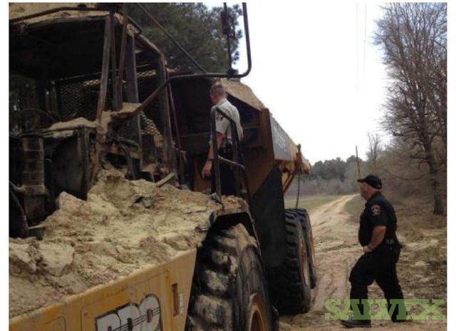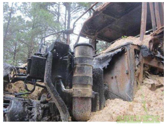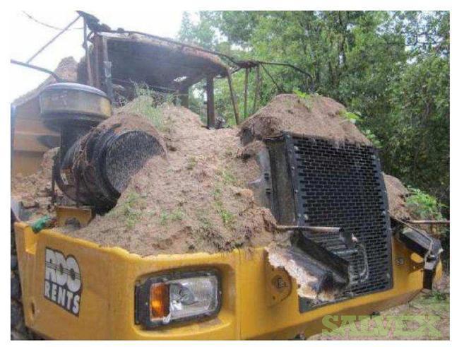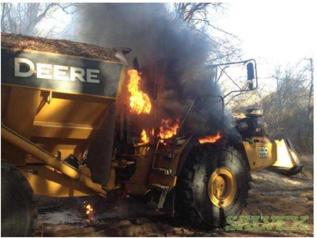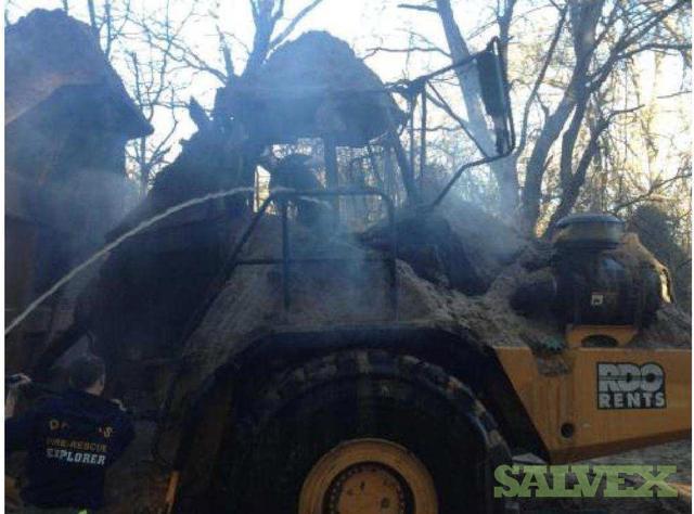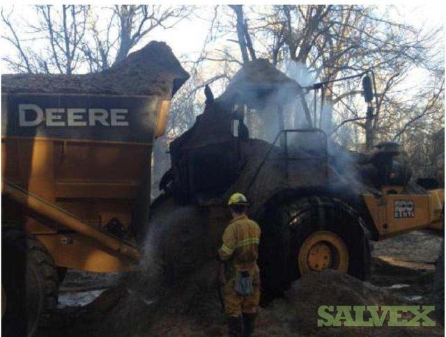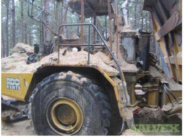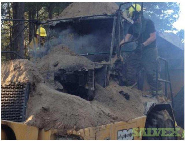 | Condition | : | The dump truck caught fire. The front portion of the articulated truck, as well as the front of the dump bed was damaged. The fire appeared to have started behind the cab and burned forward. The cab was destroyed, the exhaust, hydraulics, cab, cab frame, front drive/steering axel were damaged as well as the front tires. The fire burned through the cab into the motor compartment, burning the top of the motor, all the way up to the radiator. The hood burned. There is additional unknown damage. |