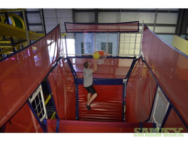 Jump shot is an extreme ultimate basketball trampoline game that is enjoyed by everyone!  Players of all ages enjoy soaring above the rim, just like the pros!. This attraction is fun and exciting and very high energy. The feeling of taking a jump shot from a three-foot vertical leap is fantastic!. This game tests your skills in a combination of volleyball and basketball. The object is to be the first person to score 10 points in the other player's basket. This unique trampoline is perfect for any FEC, Trampoline Park or Sports Complex.