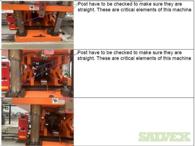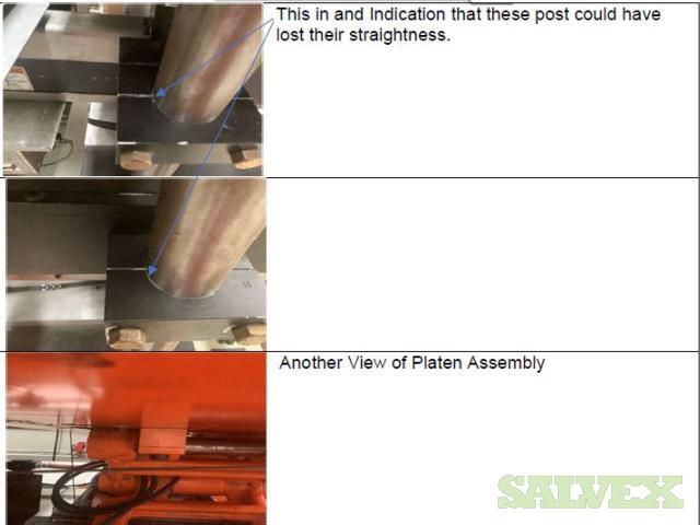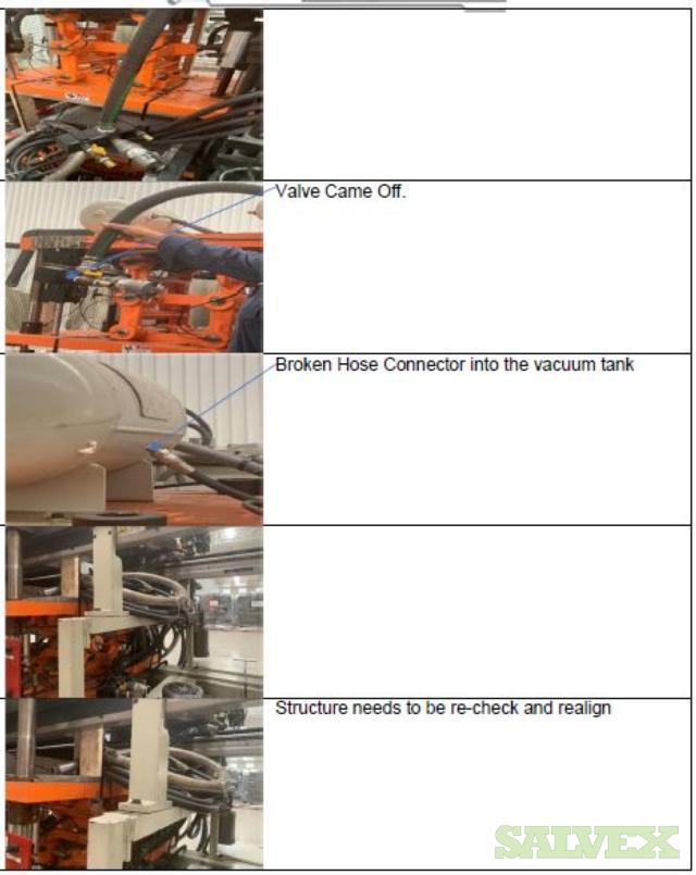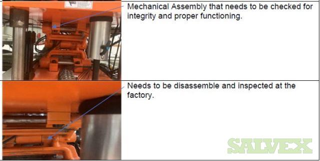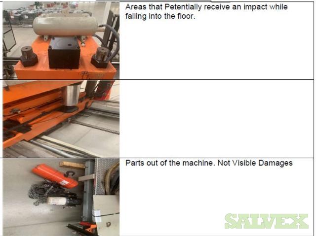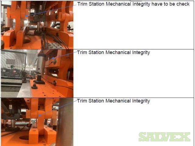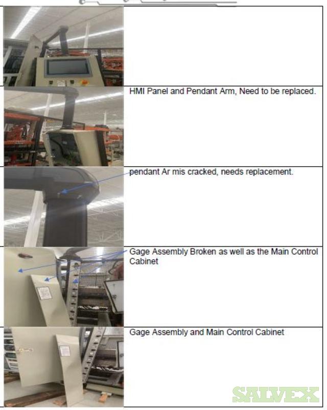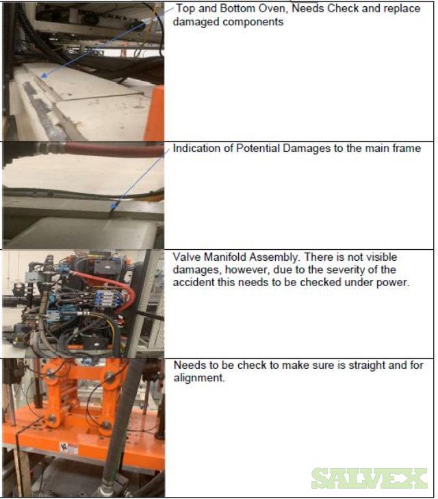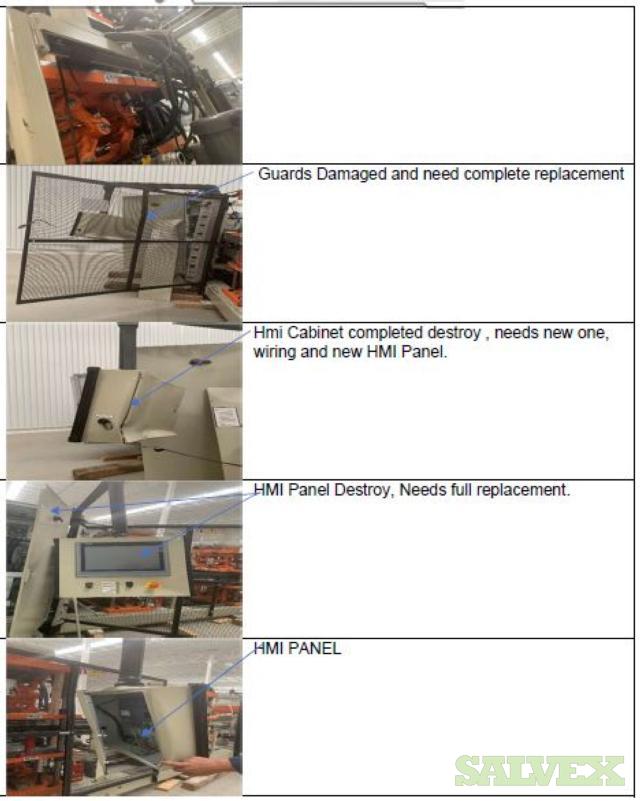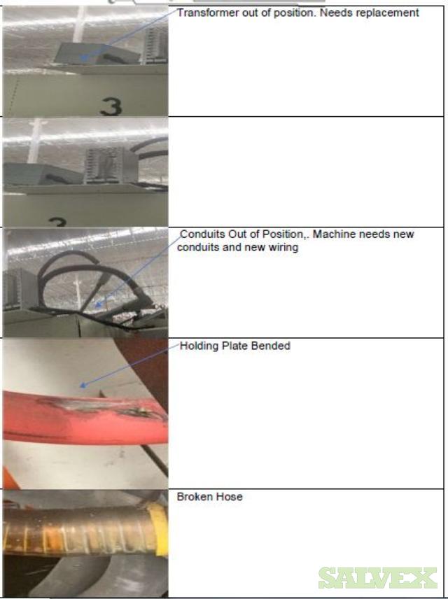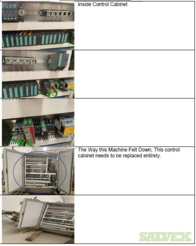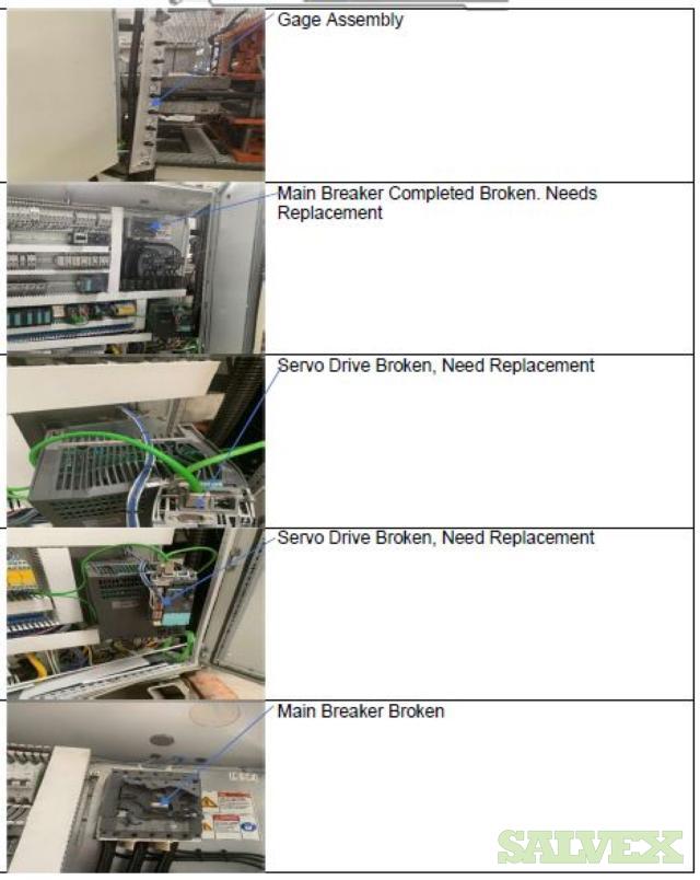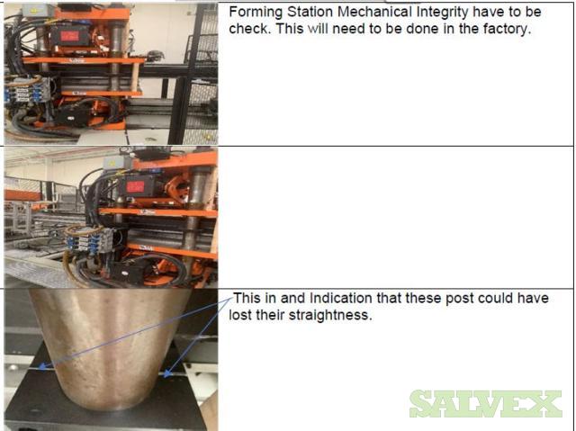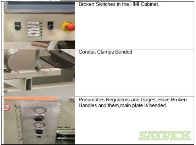 | Condition | : | Salvage asset. The seller made a complete inspection of this asset and have the following recommendations: 1- Machine needs to be shipped back to the manufacturer (Sencorp) for a total disassembly of the Forming Station Platens, Trim Station Platen, Stacker, etc.(Components that manufacturer finds to be out of specifications will need to be replaced as the machine is being re-assembled). 2- Feed Rails and Chains need to come down and inspected and its damaged parts replaced. 3- Top and Bottom Oven need to come out. 4- The manufacturer needs to verify the factory the mechanical integrity of the main frame of the machine. 5- This Machine will need a new Main Control Cabinet and needs to be rewired. It is not recommended the usage of any old components in order to avoid the metal particles dropping into the electronics. 6- The HMI Panel and HMI Arm need to be replaced as well as the HMI Siemens Scree. 7- All the guarding and safety switches need to be replaced as well and broken push buttons. 8- All Gages need to be rechecked and the bad ones need to be replaced. 9- Miscellaneous Plates, bolts, and paint need to be redone throughout the machine. 10 - The frame is bent and probably with severely damaged. All the items are "AS IS, WHERE IS". Buyer is responsible for shipping and handling. |