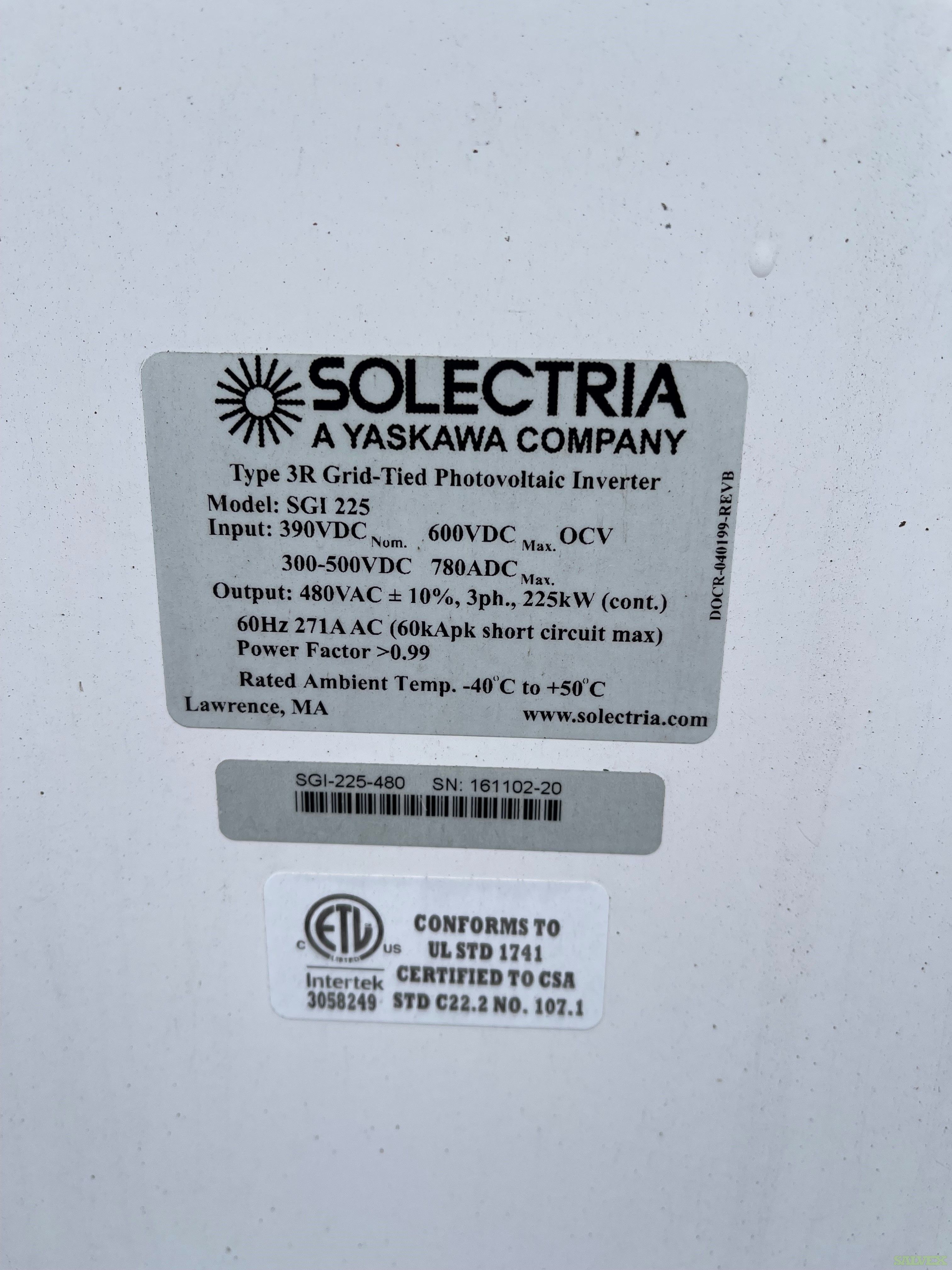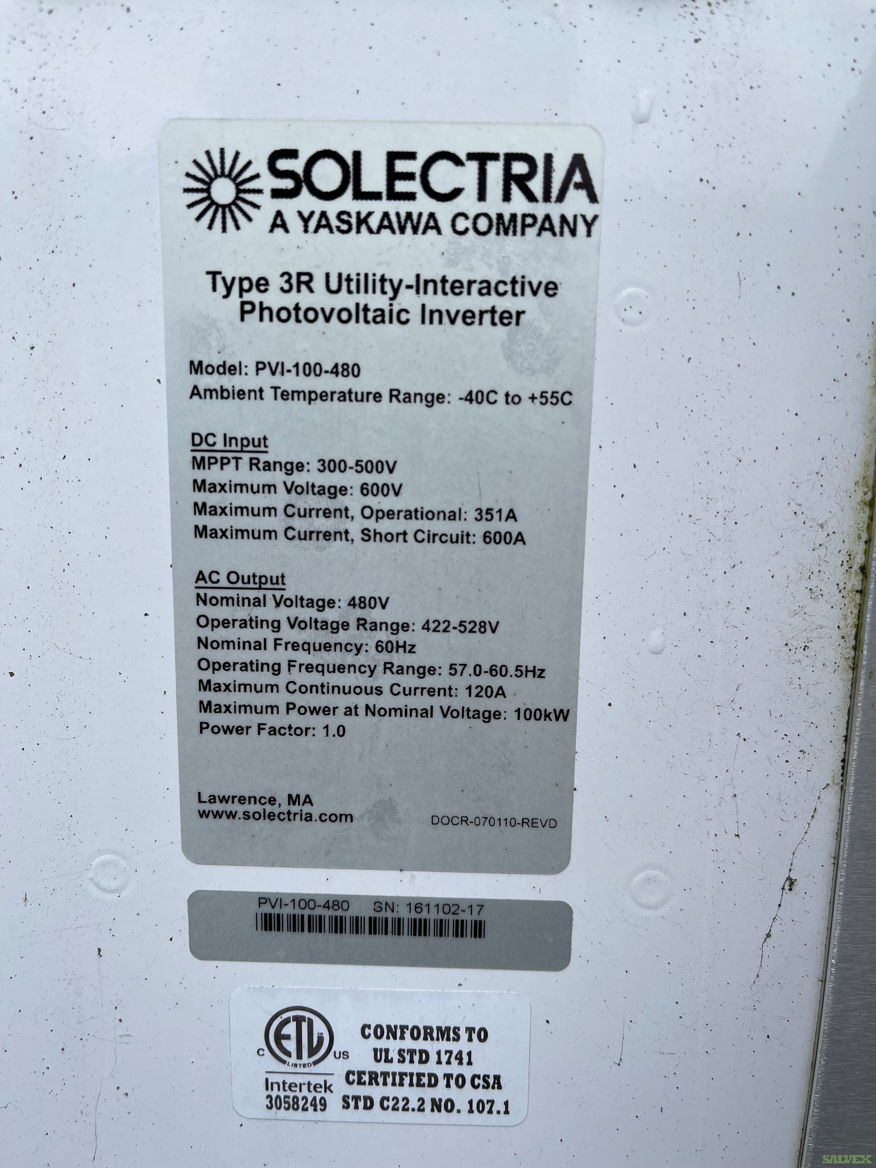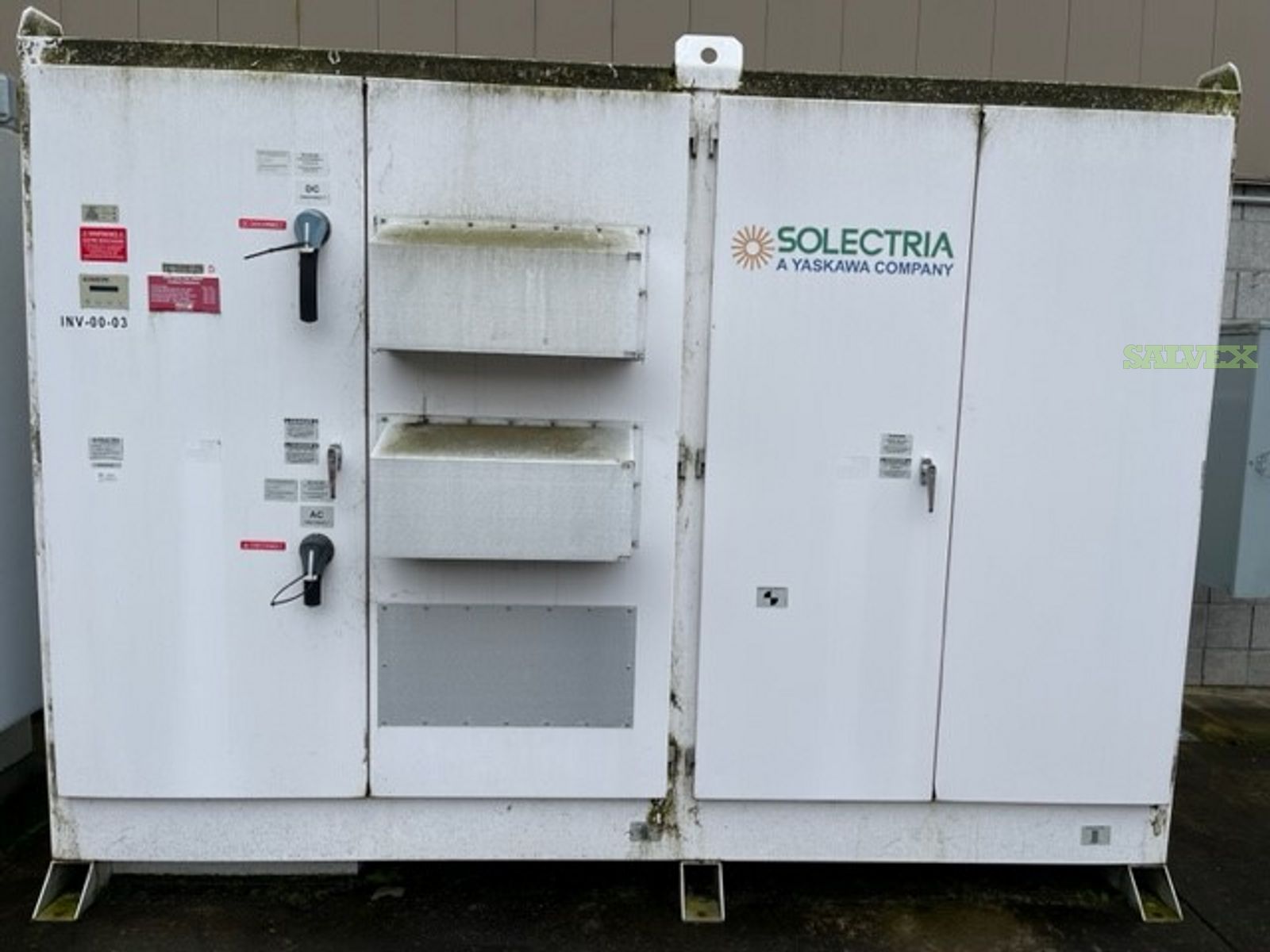 This lot of Solectria 100KW & 225KW Central Inverters is being sold by a company to recover funds and storage space.