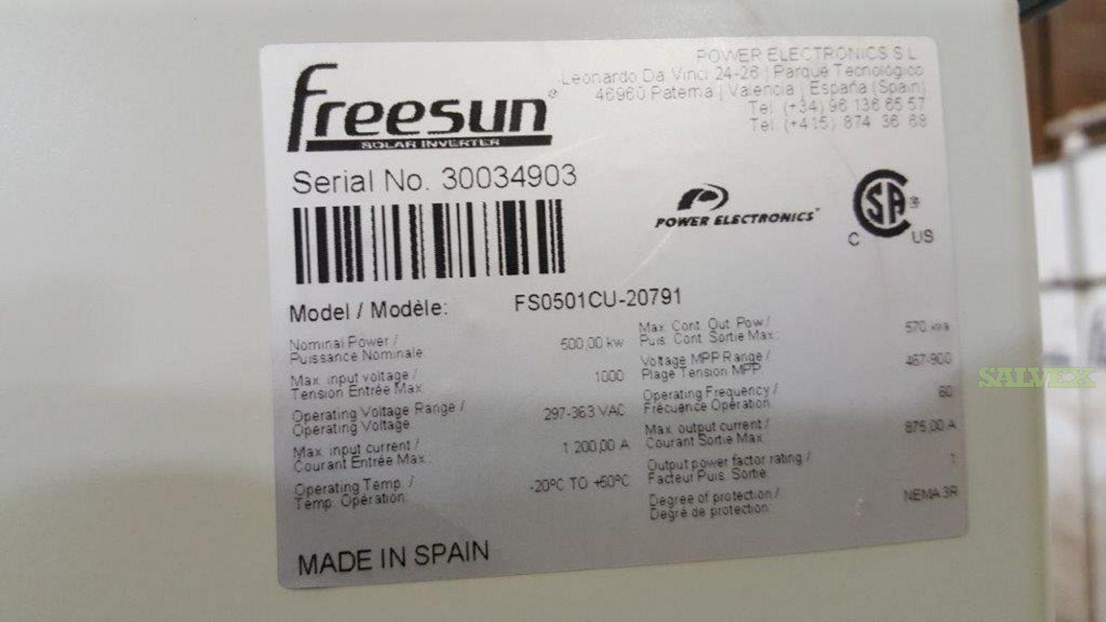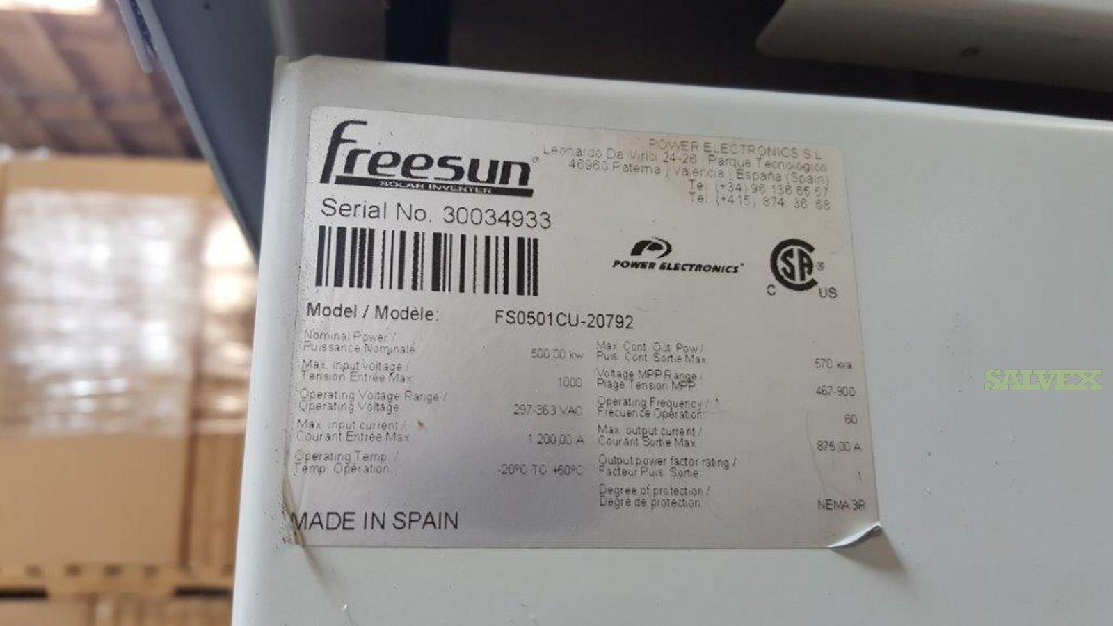 These units of Freesun FS0501CU-20791 500KW Solar Inverters are no longer needed for company's own operation and is being sold as an asset liquidation for its owner.