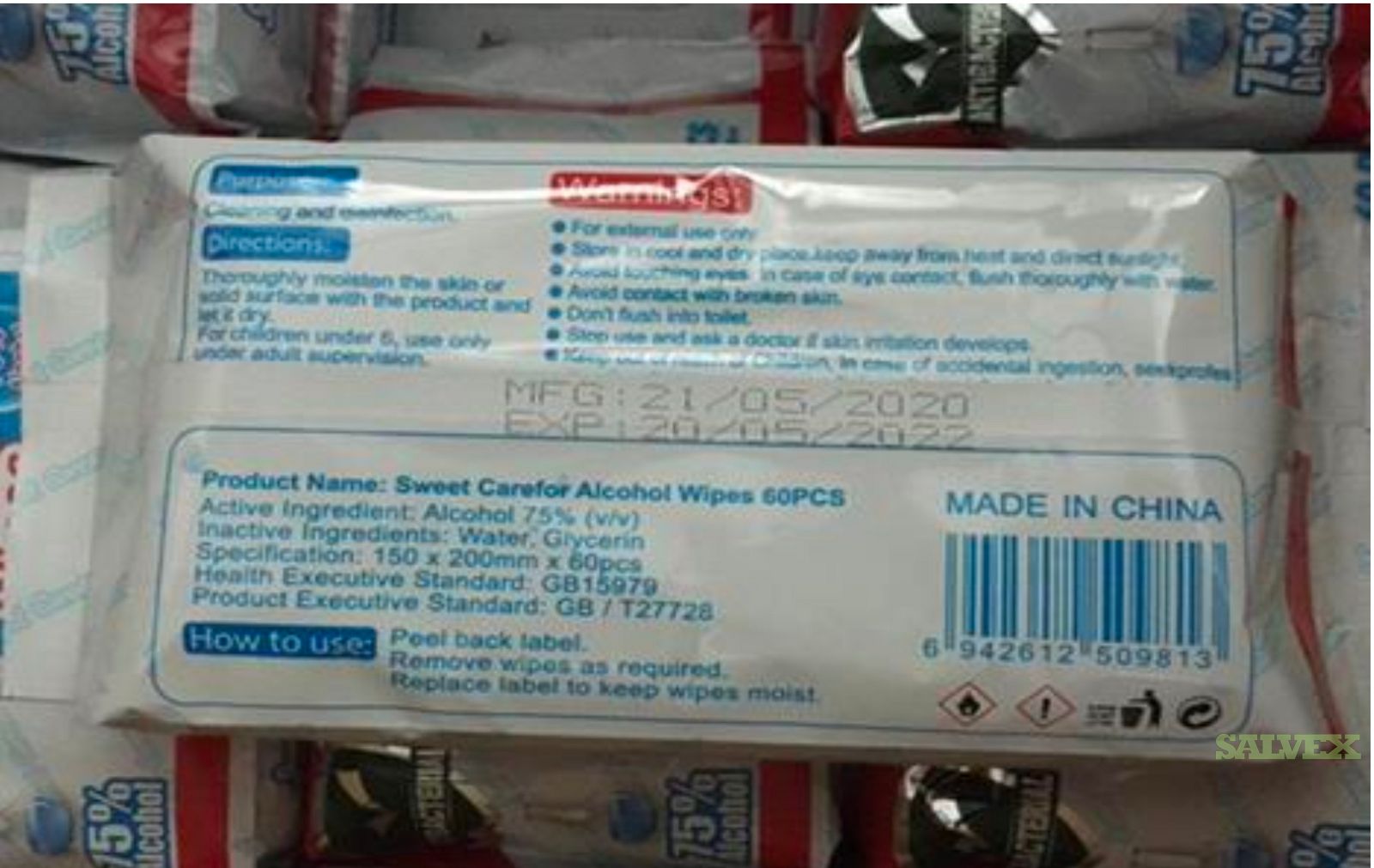 This lot of Sweet Carefor 75% Alcohol Wipes is no longer needed for company's own operation and is being sold as an asset liquidation for its owner.