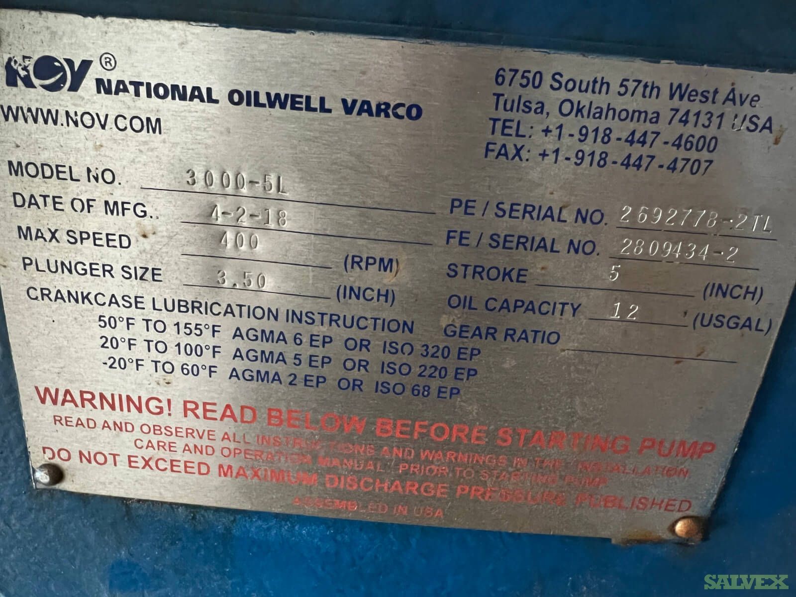 | Condition | : | This used NOV 300Q-5L Quintuplex Plunger Pump (1 unit) had its pump fully reconditioned and it was torn down completely (fluid and power end) and put in needed parts to bring the pump up to a rebuilt pump status. The pump was reinstalled on location, ran for a short period to satisfactory results, and has not been run since. The unit is in good condition and it is not ideal for the seller's specific well condition. It is being sold "as-is, where-is" with no representations, warranties, or guarantees of any kind from the Seller nor Salvex Inc. The Seller has the right to accept or reject any offers. The buyer must verify quantity & quality at the time of, or before loading the product. The buyer is responsible for the removal of units. The location will provide a crane to load the buyer's truck, so it will be for the buyer to coordinate the pick up. |