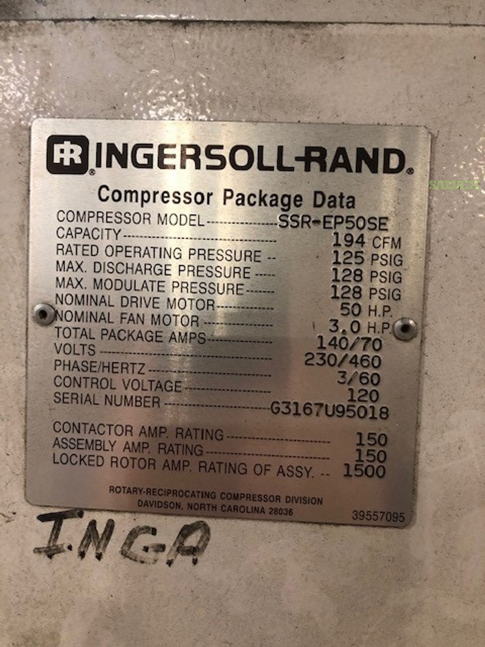 This Ingersoll Rand Compressor SSR-EP50SE (1 Unit)? is no longer needed for the company's operation and is being sold as an asset liquidation for its owner.